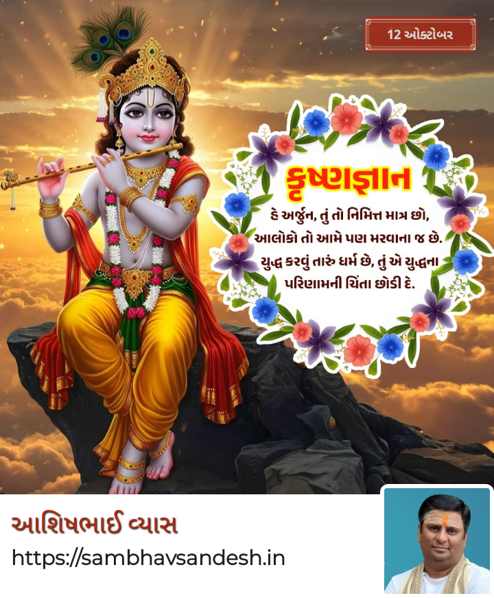 ભગવાન શ્રીકૃષ્ણે ગીતા ઉપદેશના દરેક શબ્દમાં મનુષ્યજાત માટે જીવનનું શાશ્વત તત્વ રહેલું છે. આજે પણ ગીતા માત્ર એક ધાર્મિક ગ્રંથ નથી, પરંતુ એ જીવનનું માર્ગદર્શન છે, જે દરેક યુગમાં માનવને સાચા ધર્મની દિશા બતાવે છે. એ જ ગીતા જ્ઞાનમાંથી આજે આપણે એક અતિ મહત્ત્વનો સંદેશ સમજીએ છીએ — “તમે માત્ર કર્તવ્યના નિમિત્ત છો, પરિણામની ચિંતા છોડો.”
