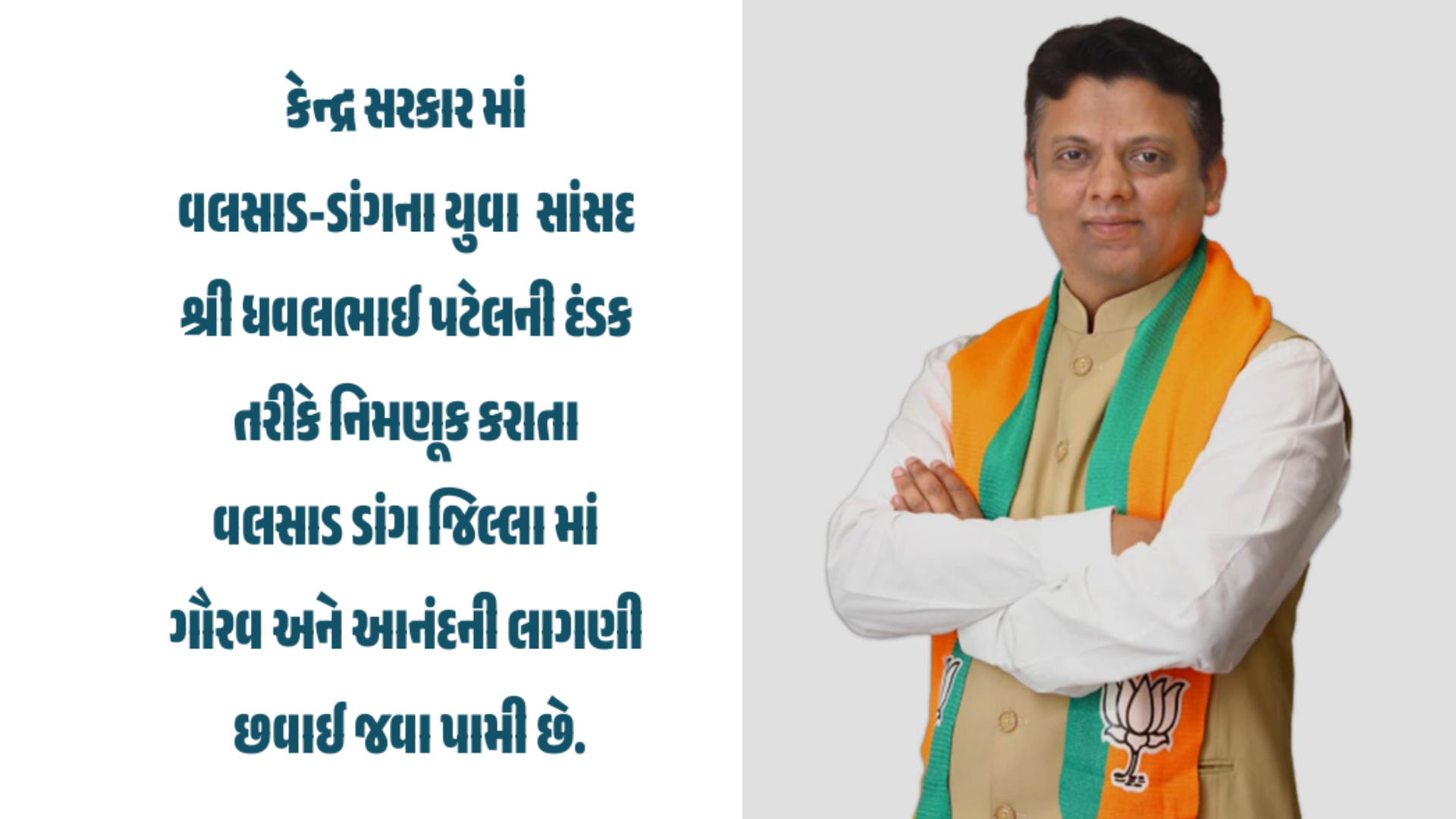 દેશના આદરણીય વડાપ્રધાન શ્રી નરેન્દ્રભાઇ મોદીજી ના નેતૃત્વમાં કાર્યરત કેન્દ્ર સરકાર માં વલસાડ-ડાંગ ના યુવા અને ઉત્સાહી સાંસદ શ્રી ધવલભાઈ પટેલ ની દંડક તરીકે નિમણૂક કરાતા વલસાડ ડાંગ જિલ્લા માં ગૌરવ અને આનંદની લાગણી છવાઈ જવા પામી છે.