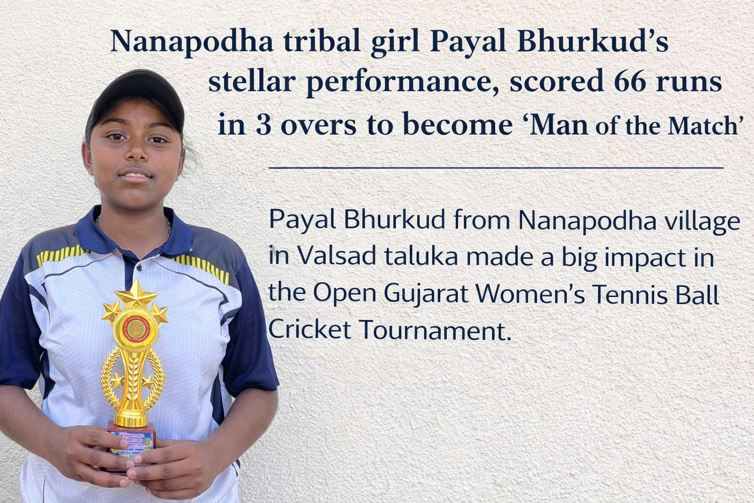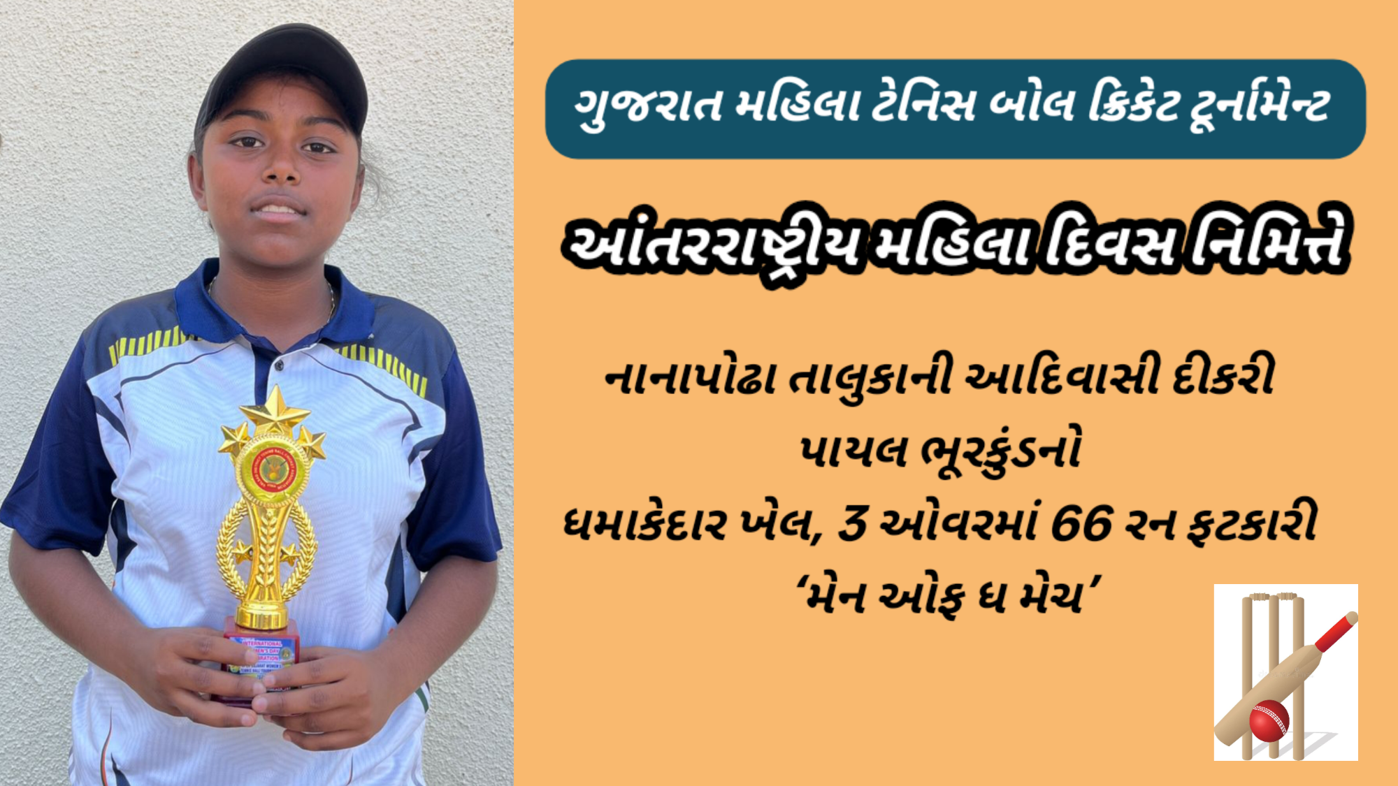 સ્પર્ધામાં ખાસ આકર્ષણ બની નાનાપોઢા તાલુકાના ભંડારકચ્છ ગામની આદિવાસી દીકરી પાયલ ભૂરકુંડ. પાયલે પોતાની શાનદાર બેટિંગથી સૌનું ધ્યાન ખેંચ્યું હતું. તેણે માત્ર 3 ઓવરમાં જ 66 રન ફટકારી તોફાની પ્રદર્શન કર્યું હતું. તેના આ દમદાર ખેલ બદલ તેને “મેન ઓફ ધ મેચ”નો ખિતાબ આપવામાં આવ્યો હતો. ગ્રામ્ય વિસ્તારની આદિવાસી દીકરીનું આ પ્રદર્શન મહિલા ખેલાડીઓ માટે પ્રેરણાદાયક બન્યું હતું.