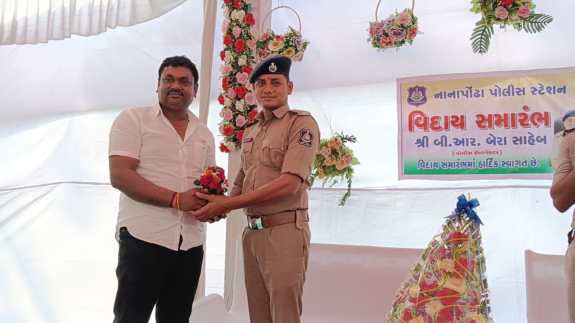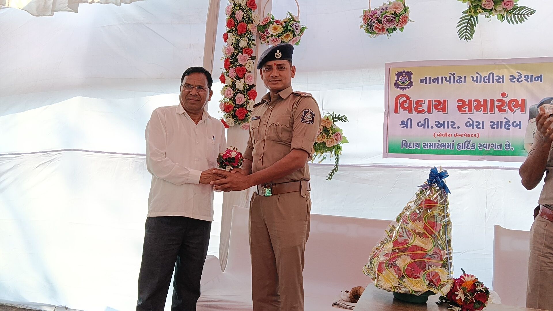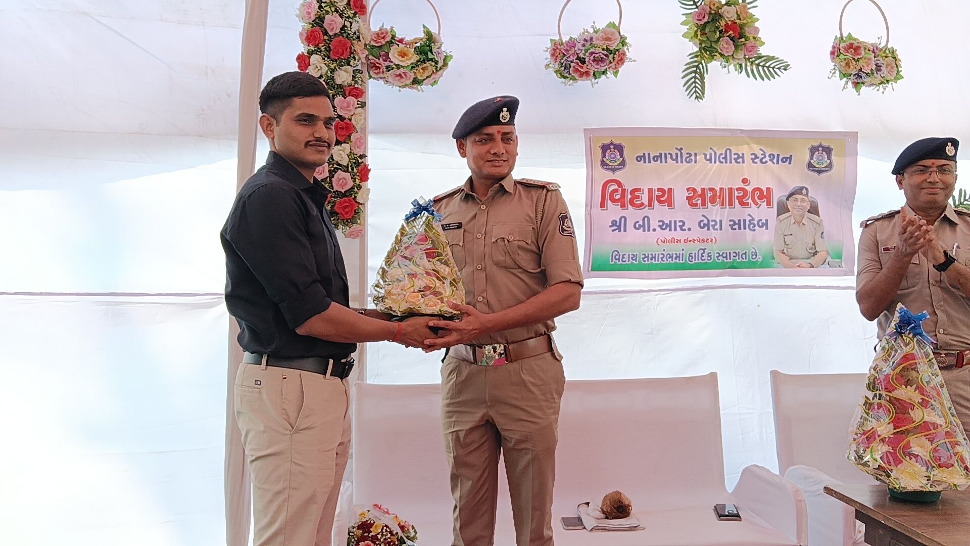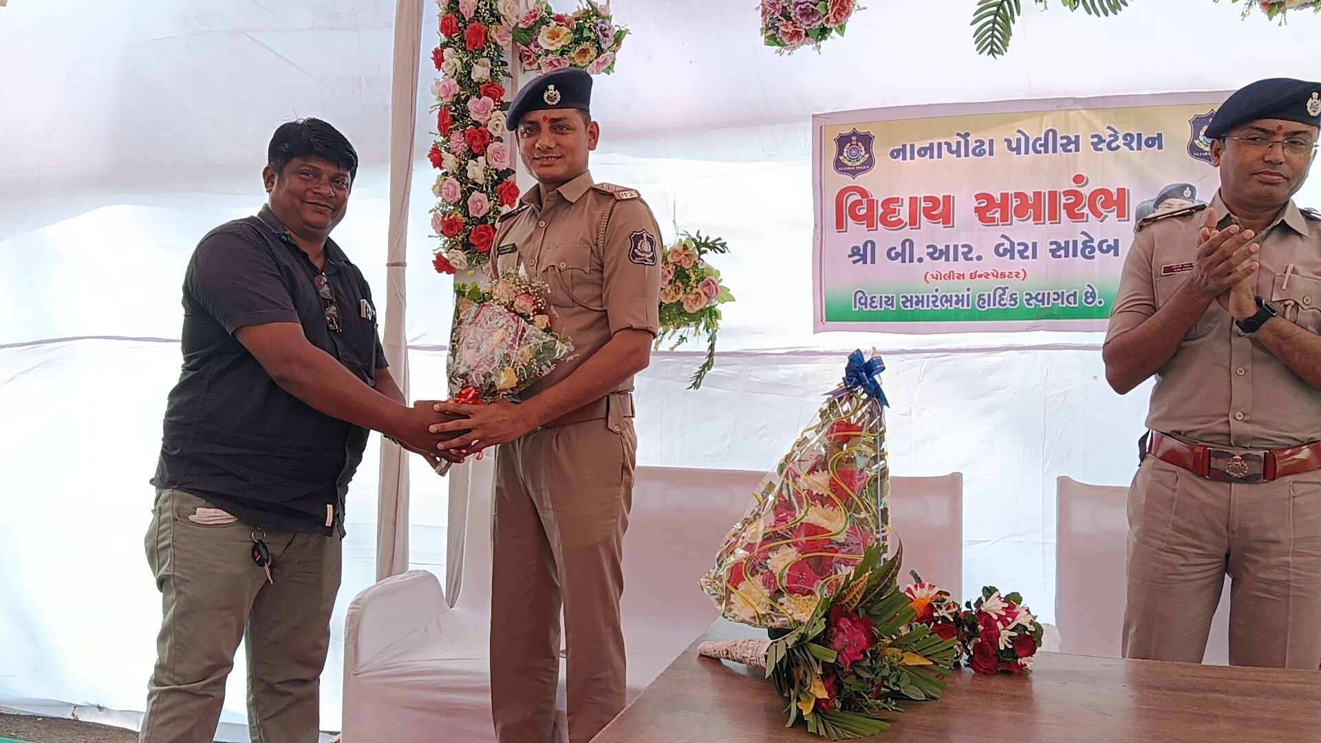 વલસાડ જિલ્લાના નાનાપોઢા પોલીસ મથકે સેવા બજાવનાર પોલીસ ઇન્સ્પેક્ટર ભીમસિંહ બેરાની બદલી થતાં તેમની માનમાં ભવ્ય અને ભાવભરી વિદાય સમારંભનું આયોજન કરવામાં આવ્યું હતું. સાથે જ નવ નિયુક્ત પોલીસ ઇન્સ્પેક્ટરનું ઉષ્માભર્યું આવકાર સમારંભ પણ યોજાયો હતો, જેમાં તાલુકાના અગ્રણીઓ, પોલીસ અધિકારીઓ, કર્મચારીઓ તથા સરપંચો મોટી સંખ્યામાં ઉપસ્થિત રહ્યા હતા.