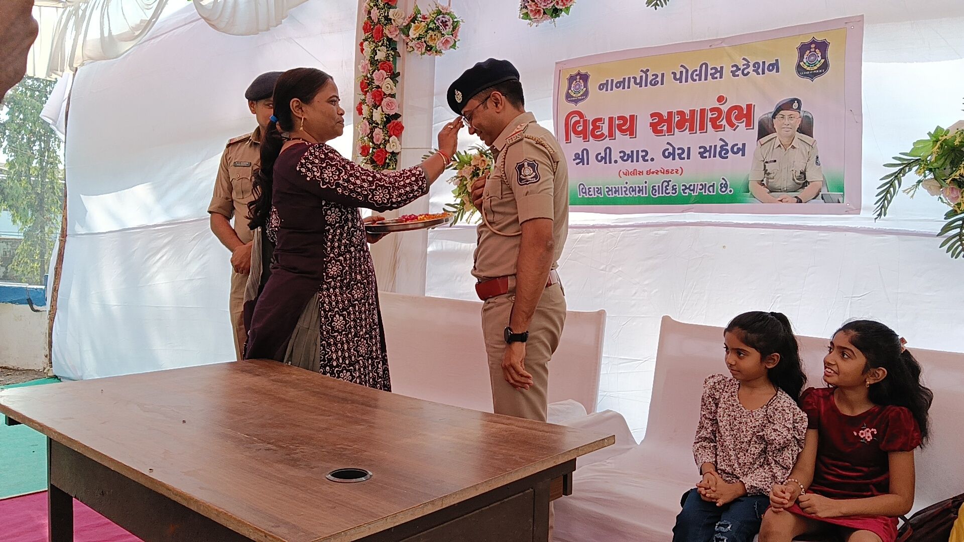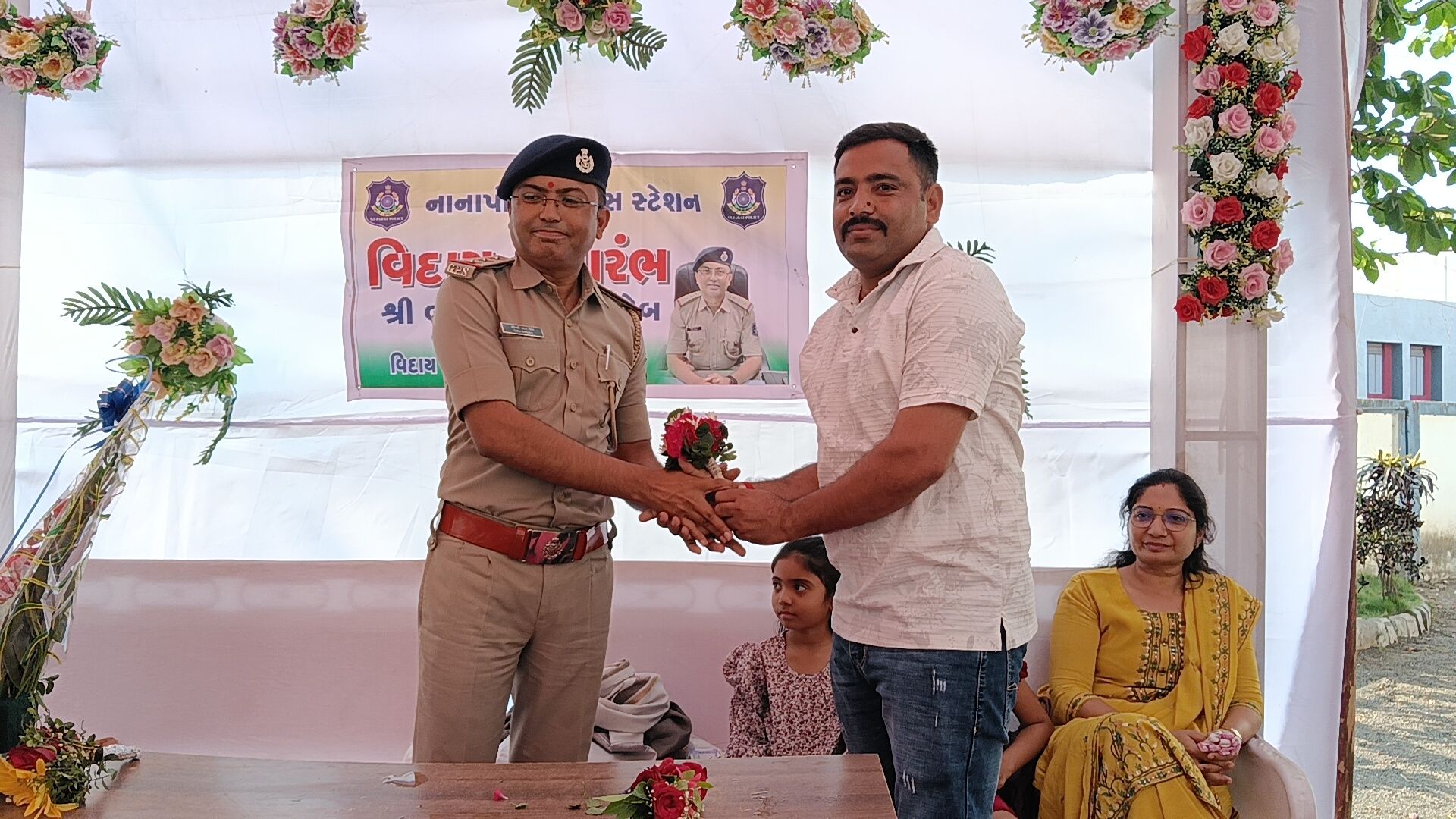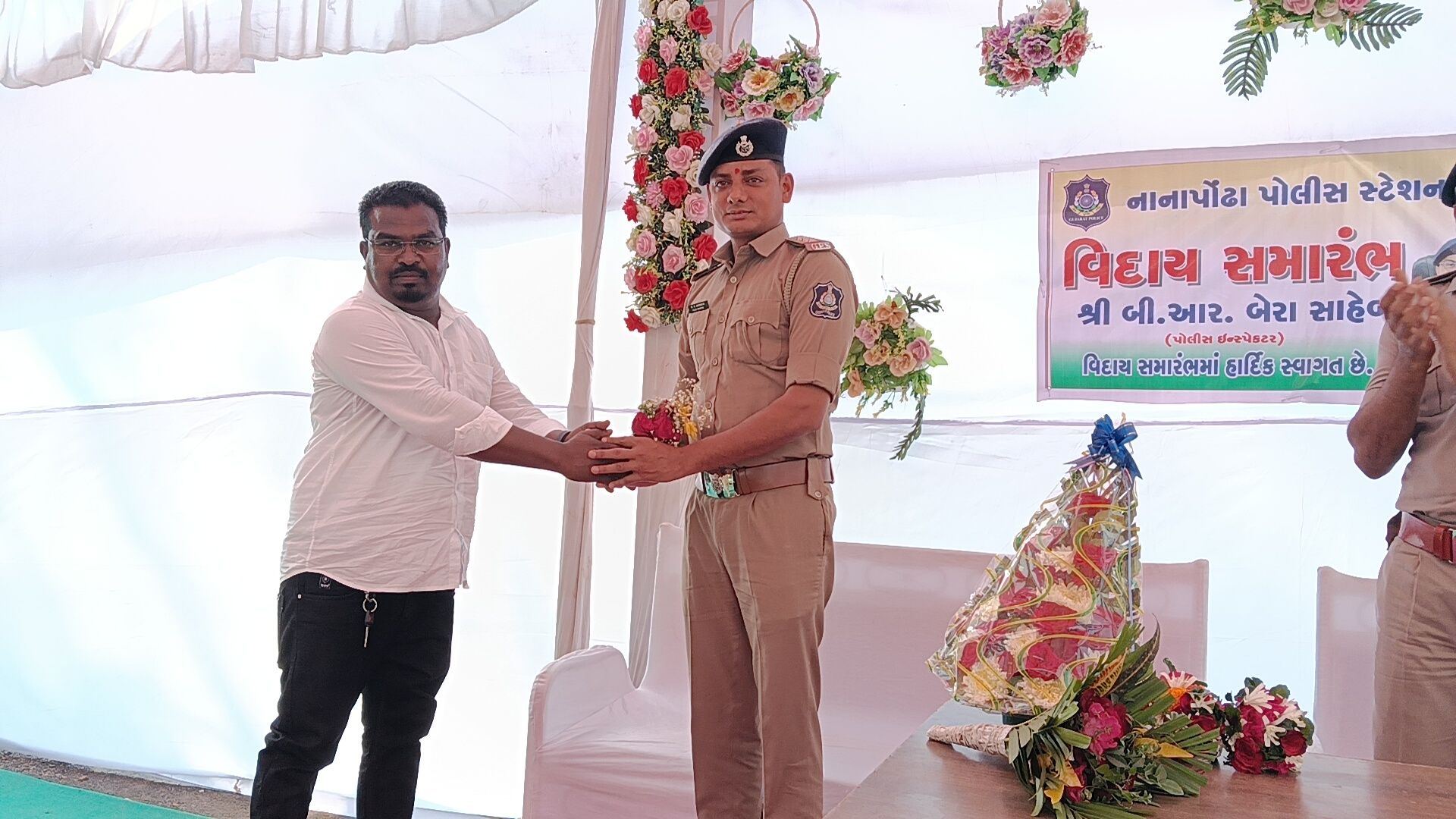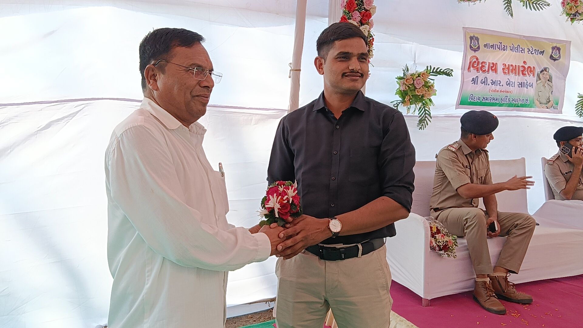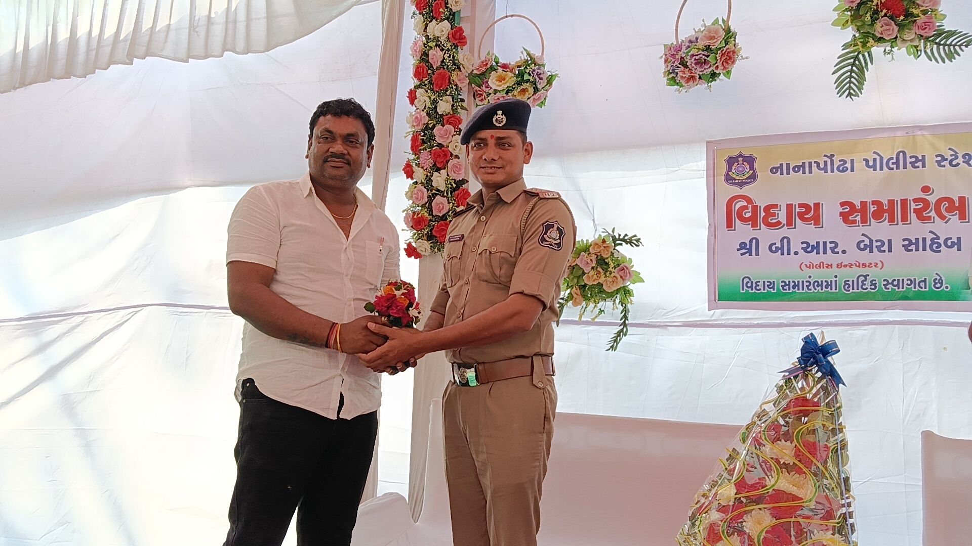 વલસાડ જિલ્લાના નાનાપોઢા પોલીસ મથકે સેવા બજાવનાર પોલીસ ઇન્સ્પેક્ટર ભીમસિંહ બેરાની બદલી થતાં તેમની માનમાં ભવ્ય અને ભાવભરી વિદાય સમારંભનું આયોજન કરવામાં આવ્યું હતું. સાથે જ નવ નિયુક્ત પોલીસ ઇન્સ્પેક્ટરનું ઉષ્માભર્યું આવકાર સમારંભ પણ યોજાયો હતો, જેમાં તાલુકાના અગ્રણીઓ, પોલીસ અધિકારીઓ, કર્મચારીઓ તથા સરપંચો મોટી સંખ્યામાં ઉપસ્થિત રહ્યા હતા.