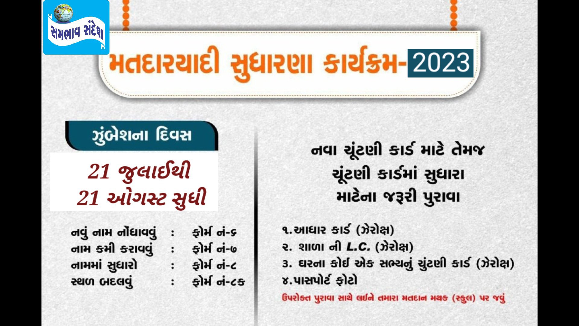 પહેલી જાન્યુઆરી, 2024ની લાયકાતની તારીખને ધ્યાનમાં રાખીને ચૂંટણી પંચ દ્વારા ખાસ મતદાર સુધારણા કાર્યક્રમ પૂર્વેની પ્રવૃત્તિઓ અને ફોટા સાથે મતદાર યાદીને આખરી કરવા માટે કાર્યક્રમ જાહેર કરવામાં આવ્યો છે. આ કાર્યક્રમ હેઠળ બૂથ લેવલ ઓફિસર (BLO) દરેક ઘરની મુલાકાત લેશે. આ માટે BLO 21 જુલાઈથી 21 ઓગસ્ટ સુધી જેતે વિસ્તારમાં મતદારોની વિગતો એકઠી કરશે.