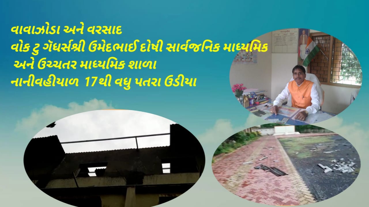 16/05/2021 ને રવિવારના રોજ આવેલા વાવાઝોડા અને વરસાદ ના કારણે વોક ટુ ગેધર્સ શ્રી ઉમેદભાઈ દોષી સાવઁજનિક માધ્યમિક અને ઉચ્ચતર માધ્યમિક શાળા નાનીવહીયાળ તા ધરમપુરના સિમેન્ટના 17થી વધુ પતરા ઉડી ને નીચે પટકાતા તૂટી ને ભુક્કો થઇ જવા પામ્યા છે